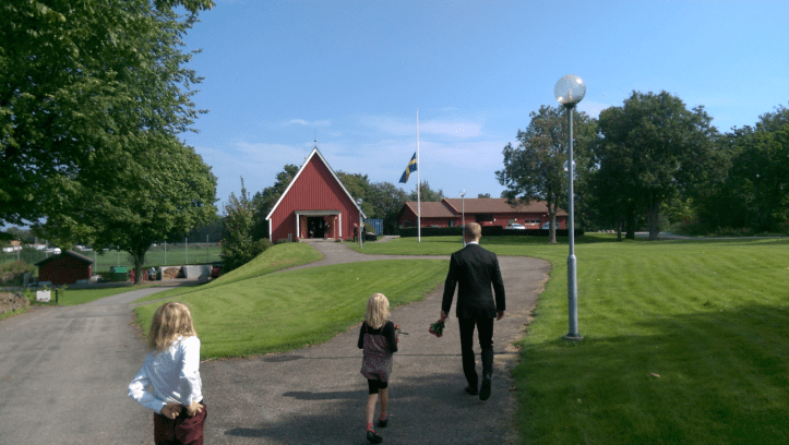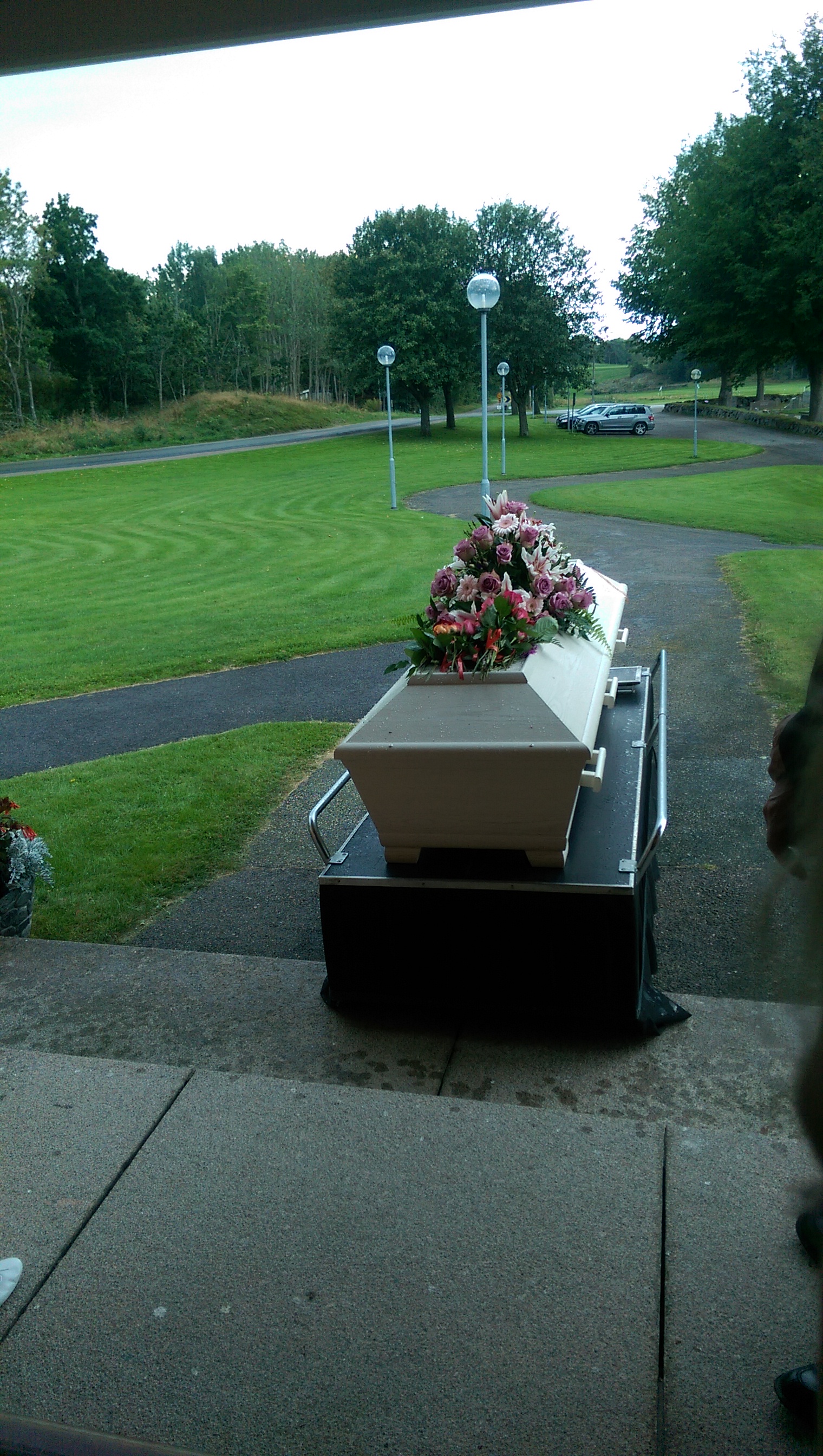 Anyway så föreslog prästen att vi står i dörröppningen och säger farväl och lägger blommor och så går dom själva ut senare där skyfallet är över och lägger kistan i jorden? Ja jo det låter ju bra, så gör vi. Ingen sentimentalitet här inte – vi lämnar mormor i sticket i det sista på grund av regn. Håhåjaja, så blir det tydligen tillslut.