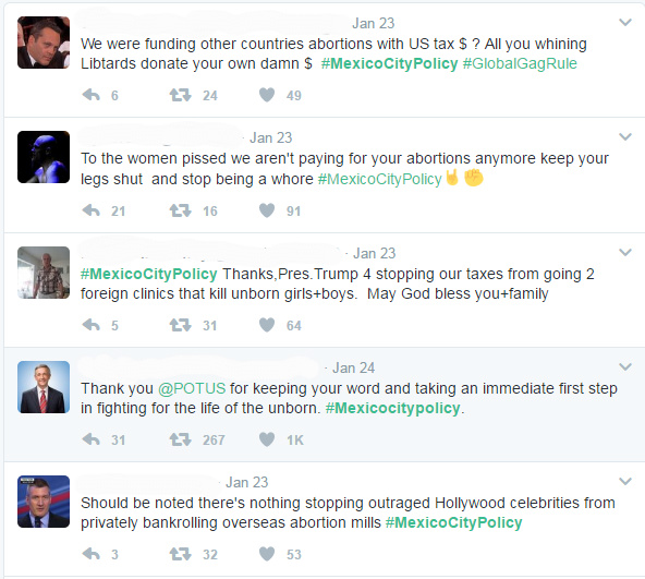 En snabb koll i Twitterverset visar att många applåderar och tycker att det är bra att han inte längre slösar bort amerikanska pengar på att döda ofödda barn i utlandet.