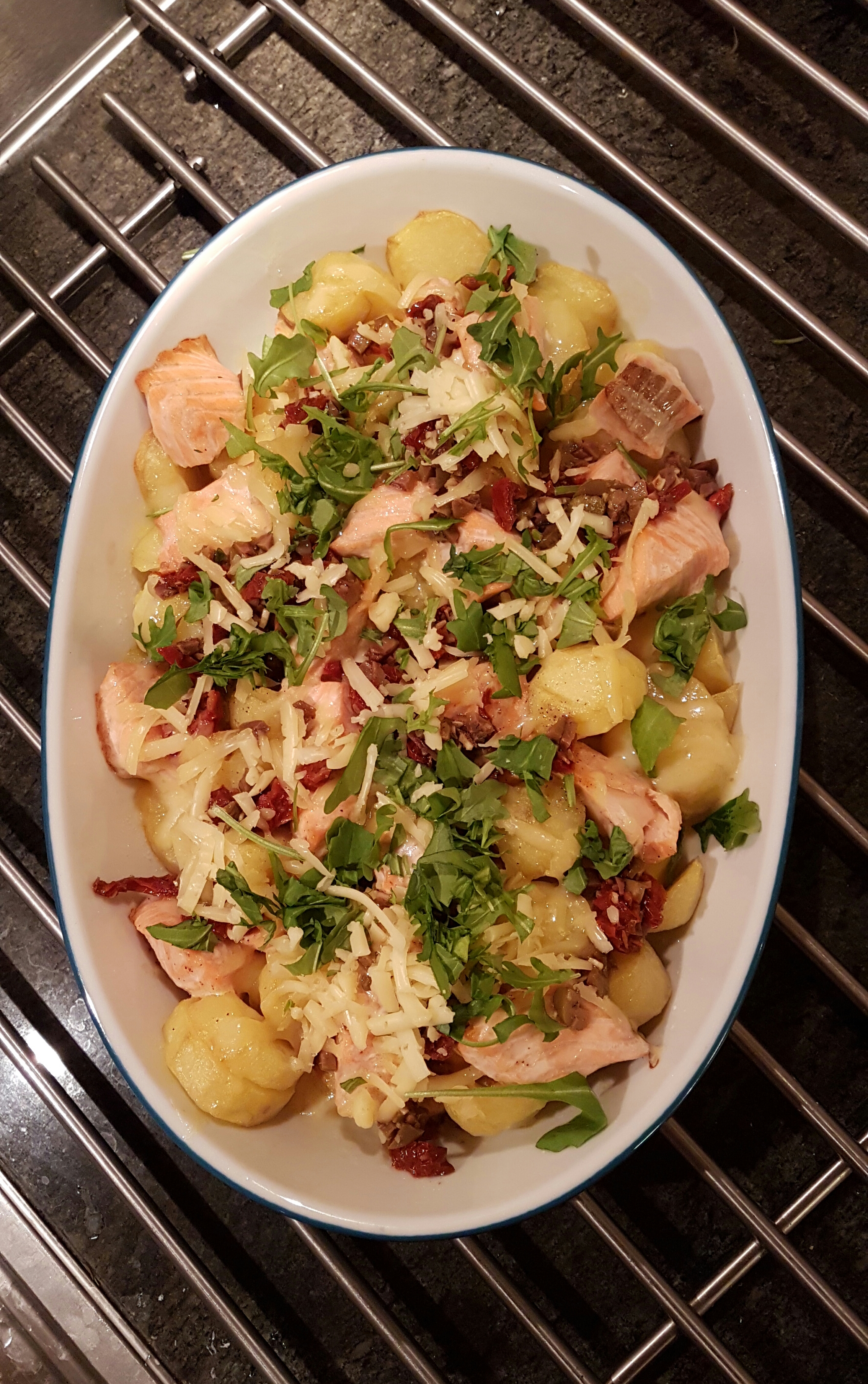 - Häll tomatröran över laxen och potatisen (förutsatt att potatisen nu är helt genomstekt), strö över osten och en del av ruccolasalladen. Servera resten av salladen bredvid.