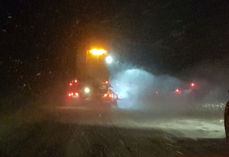 Kraftigt snöfall och hårda vindar. En del av sträckan har vi haft vår vän plogbilen framför oss. Det har den goda egenskapen att den förutom rensar vägen på snö även håller hastigheten på bilarna på en vettig nivå – ingen vill ju köra om en plogbil…