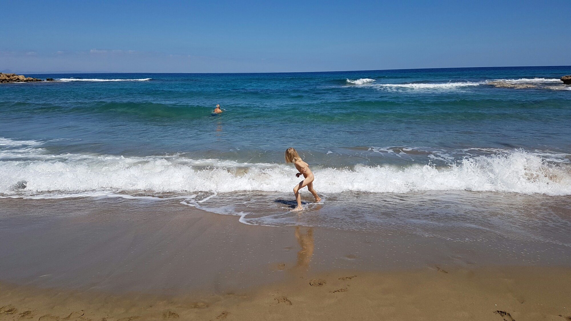 Dom var förvarnade om att vattnet inte kommer att vara på sitt varmaste, men det verkade inte spela någon roll. Solen var skön och man kan ju iallafall leka lite med vågorna. Först med kläder på men sen kom tråkiga mamman (=jag alltså) och erbjöd badoutfit i utbyte mot kläder, eftersom man ser ju vartåt det bär lixom…