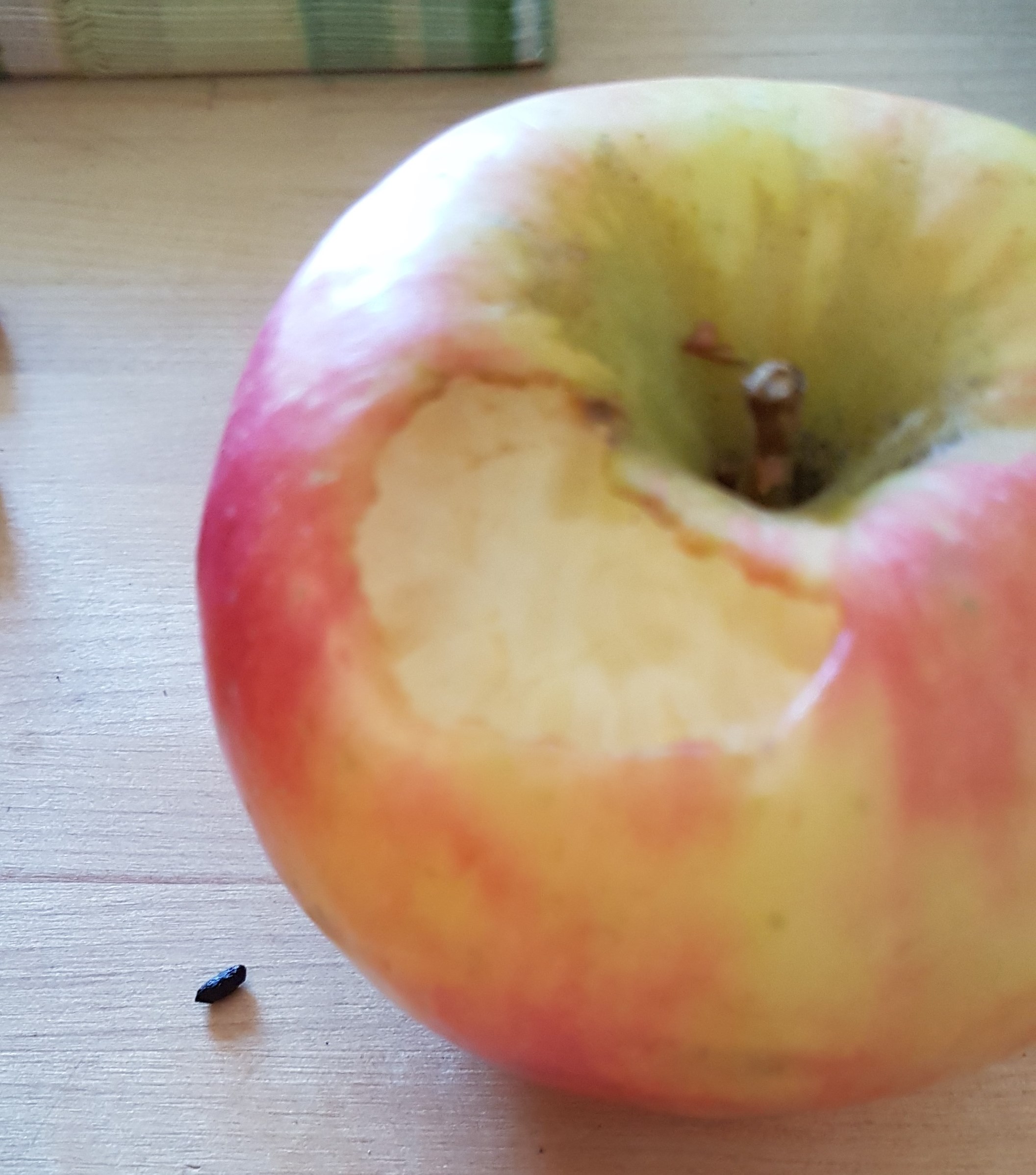 En stund efter frukosten idag var det mystiska spår på ett äpple. Små tuggspår. Färska dessutom, inte en aning av brunt. Barnen förklarade sig oskyldiga med så fullständigt blåögd uppsyn att det inte gick annat än att tro dom. Dessutom brukar dom inte ta en så liten tugga och sen lägga tillbaks, det är sånt som tvååringar gör. En minut senare fick gåtan sin lösning. En muslort låg mitt på avlastningsbordet vi har i köket.