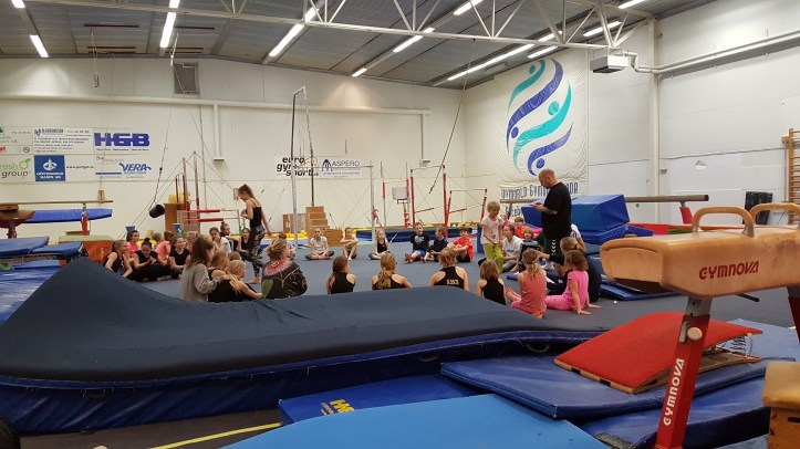 Dom gjorde mycket annat också, och det var två grymt bra dagar som gav alla ”våra” tre barn en massa inspiration, boost och mästringskänsla. Till exempel så har dom en liten skeppsklocka som man får klinga i när man klarat något svårt för första gången, och när klockan klingar applåderar alla i salen – obereoende om dom sett vad som hänt eller inte. Det är som en betingad reflex bland gymnasterna att när klockan klingar så applåderar och tjoar man för att då vet man att någon gjort nåt stort, och på så sätt är dom med och boostar varandra kontinuerligt. Himla fint!