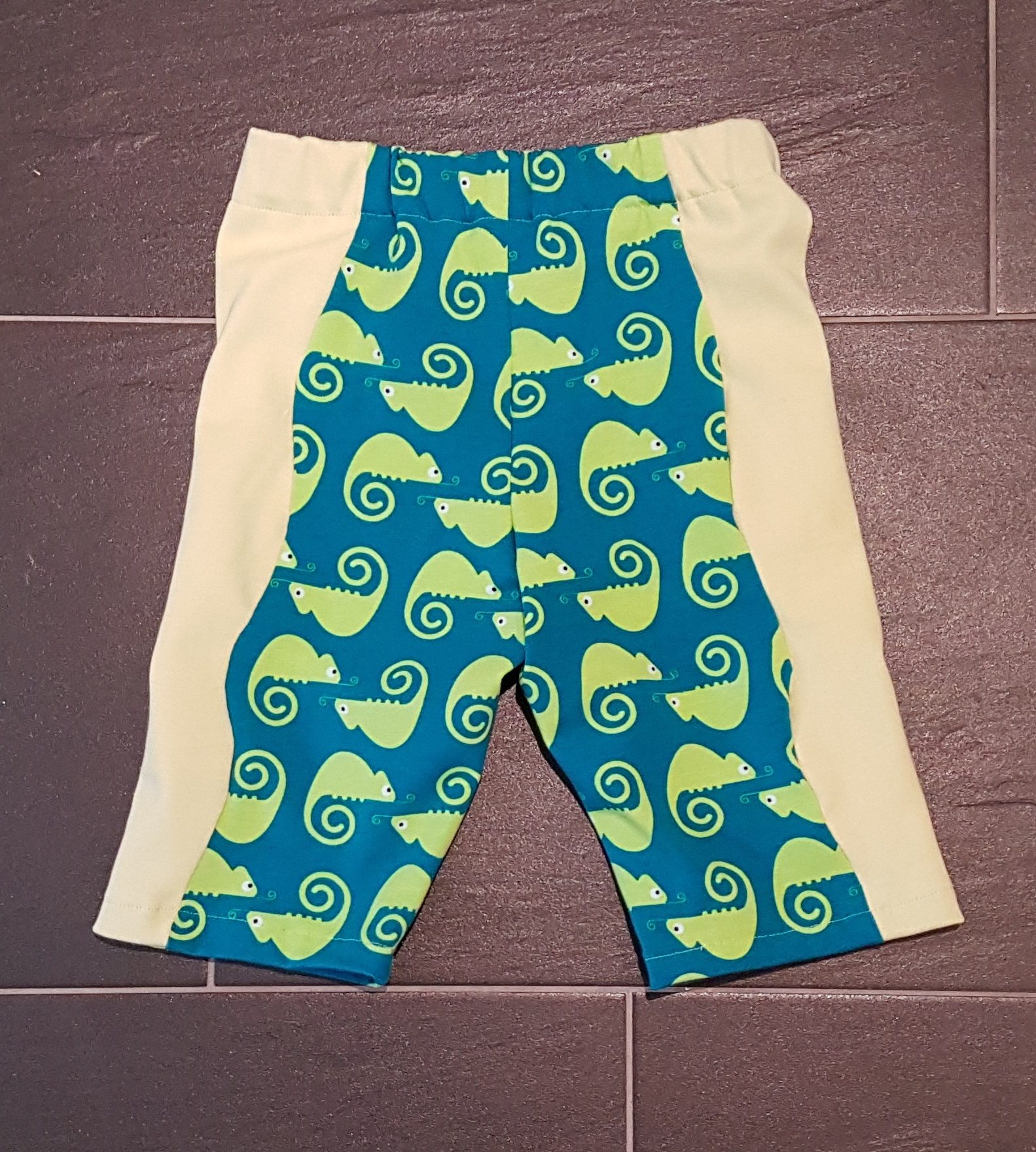 Och sist ut just idag var ett par med kameleonter på – även det tyget är använt för två år sedan. Här ville jag göra i det gulgröna tyget som huvudtyg och kameleonterna i sidorna, för då hade han fått långa leggings, men han var mycket bestämd på att han hellre ville ha korta men med större delen kameleonttyg (det var brist på det) och han skulle kalla dom för sina Pascalbyxor (Pascal är Rapunzels kameleont och sidekick i Disneyfilmen Rapunzel).
