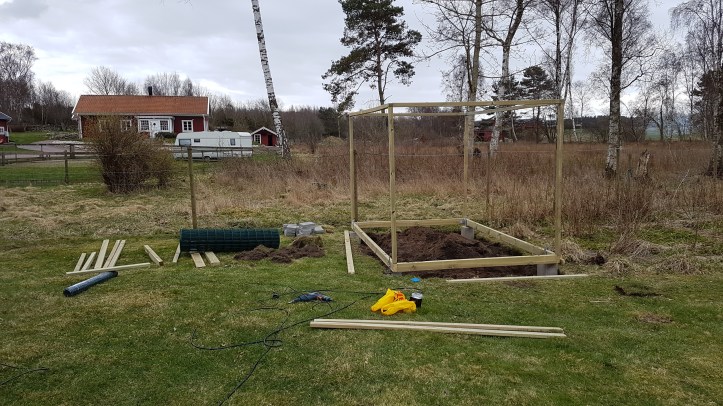 Men skam den som ger sig, eftersom idag och imorgon är lite av sista chansen för att få upp det här innan allt redan skulle varit planterat. Så vi högg i. Och efter några timmar hade vi en stomme ovanpå våra cementplintar och vår grundram.
