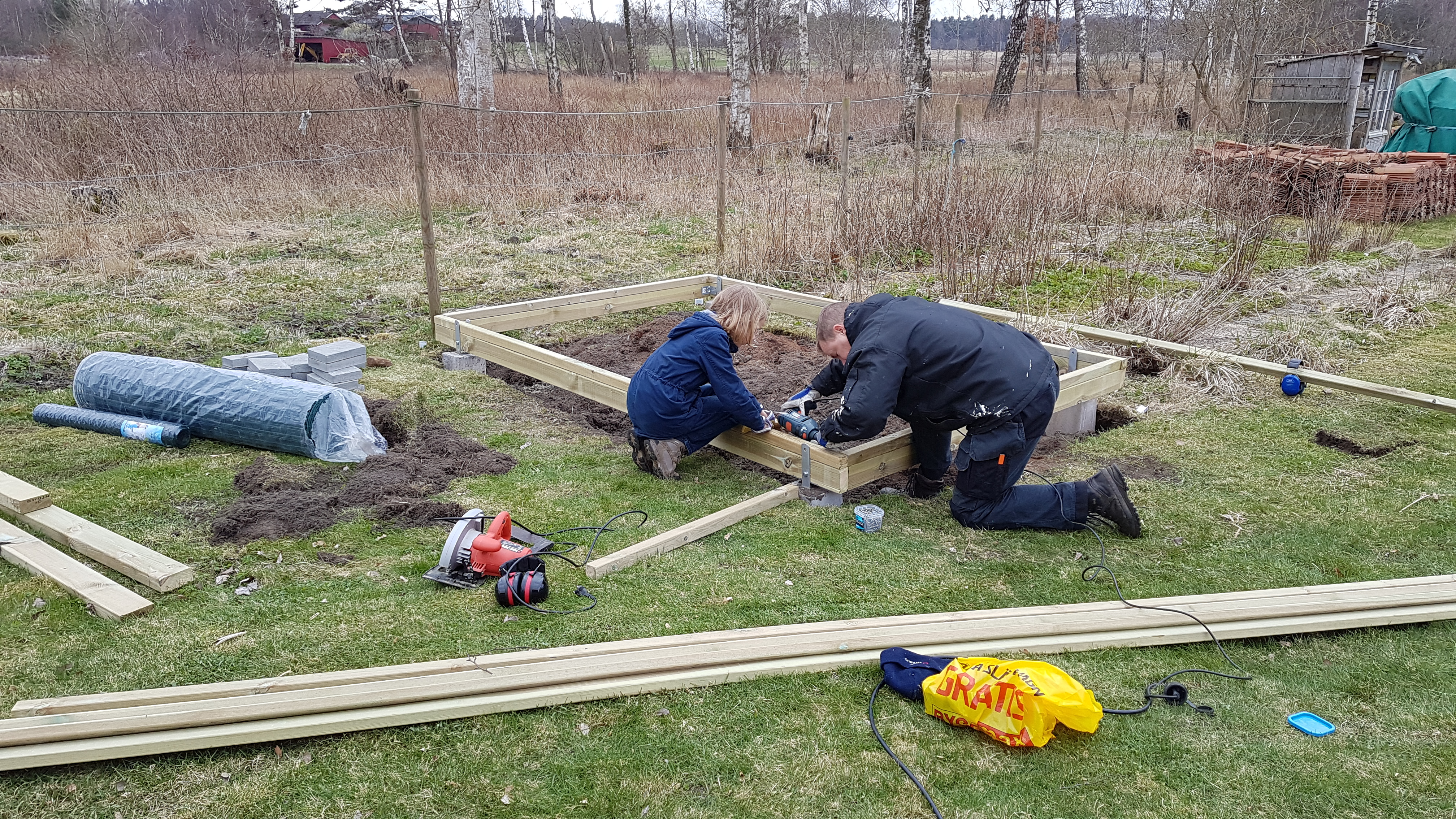 Men skam den som ger sig, eftersom idag och imorgon är lite av sista chansen för att få upp det här innan allt redan skulle varit planterat. Så vi högg i. Och efter några timmar hade vi en stomme ovanpå våra cementplintar och vår grundram.
