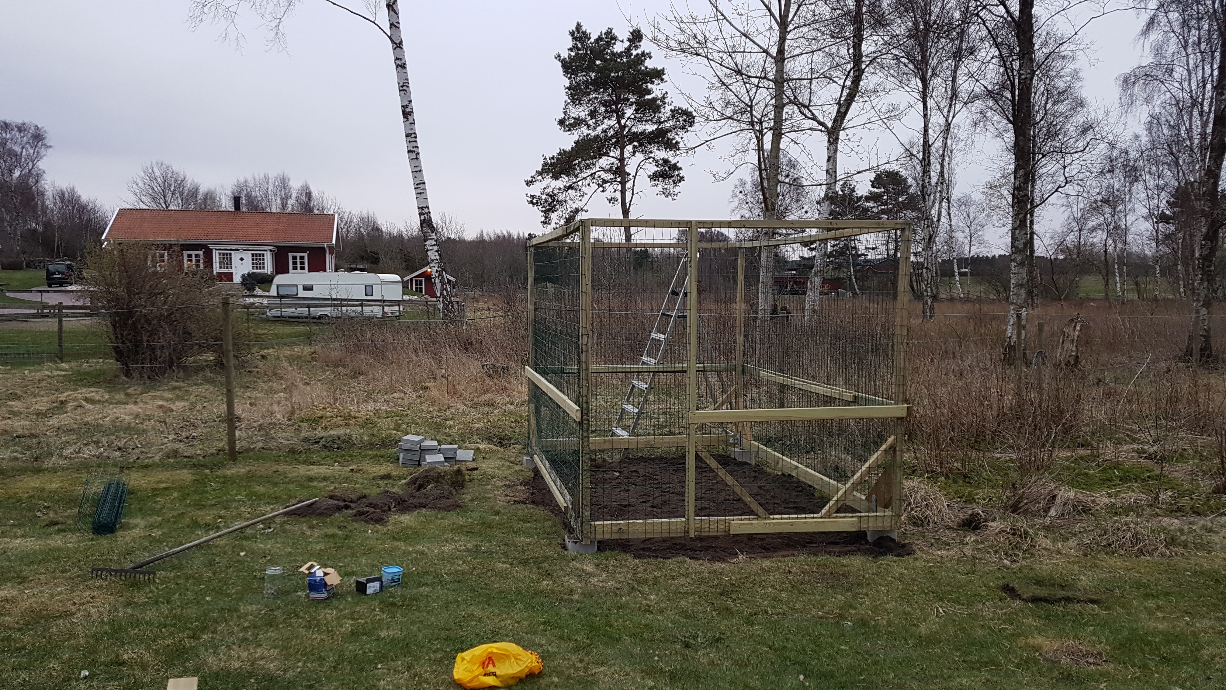Det är ju NATURLIGTVIS mycket stabilt byggt. Rådjuren gillar visst att försöka stånga och trycka ner eventuella burar för att komma åt godiset inuti, så en viss stabilitet måste det vara. Sen har vi säkert överdimensionerat det hela, men buren är nu näst intill perfekt, och iallafall precis som vi tänkte oss. Nederst är det hönsnät och ett annat galler, och på övre 2/3 är det vad ByggMax kallar ”stängsel”. Ordentligt förankrat upptill, på mitten och nedtill.