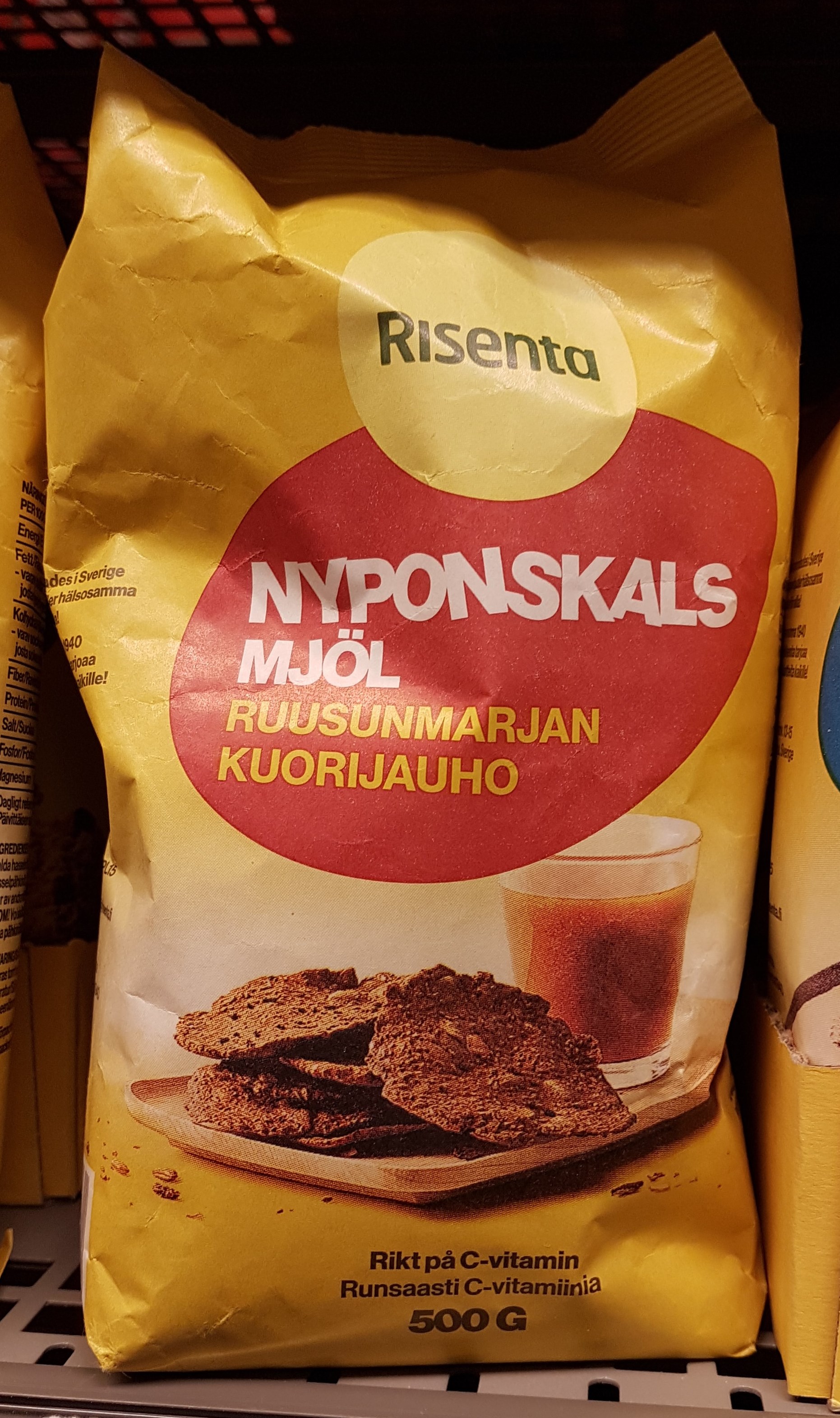 Dagens nya bekantskap (i jakten på hampafrö, en annan ny potentiell bekantskap) var Nyponskalsmjöl. WHAT?! Varför? Första tanken är ju att det är ett desperat försök i dessa vegotrender att försöka göra geschäft på vad som helst som är vegetabiliskt och som går att mala ner och kalla mjöl.
