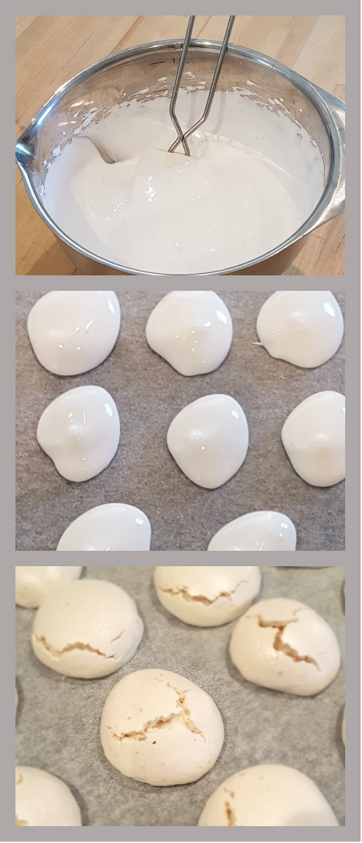 Klicka eller spritsa ut marängerna på en plåt, grädda i 100 grader 90 minuter, låt svalna på plåt i ugn.