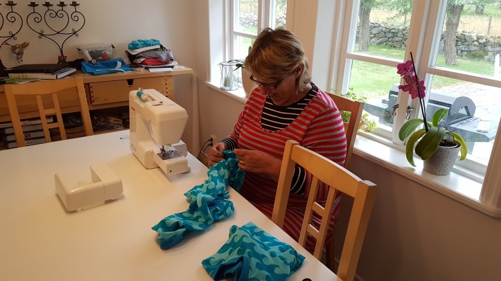 Som det härliga tyget med ljus-och mörkturkosa vågor på. Perfekt när A’s pyjamas är ca 15 cm för kort i benen och lite väl tight över armarna.