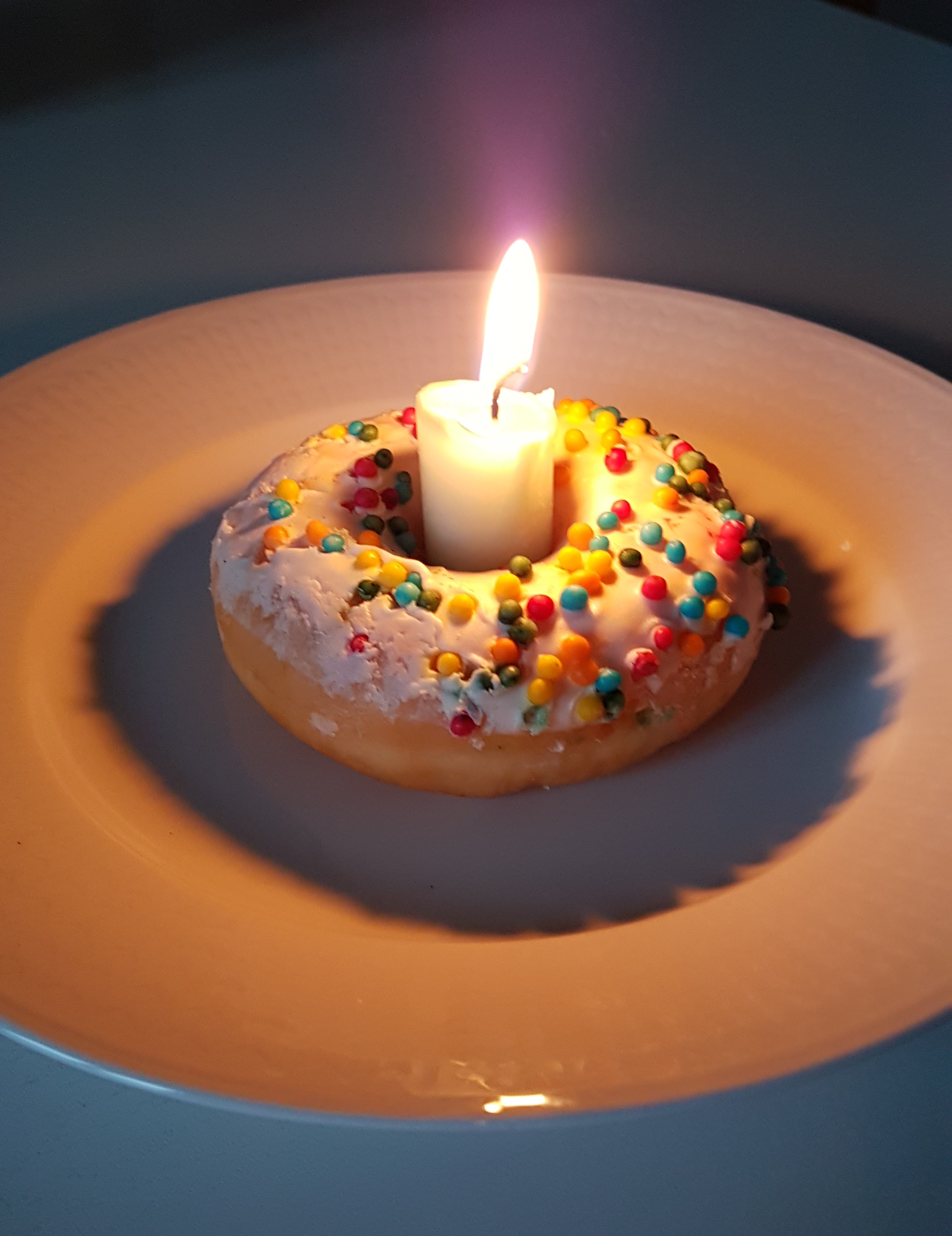 Klockan sex i morse väckte jag Hannes och vi preppade morgonfikat. En dougnut med ett stearinljus i 😀