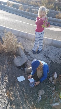 Tack vare den här fantastiska hobbyn vi har fick vi anledning att stanna till i en uttorkad flodfåra i en hårnålskurva (hade man ju bara kört förbi annars) och klättra ner. Där nere växte det mandelträd, så vi plockade mandlar från marken, knäckte med en sten om snacksade på medan vi utförde andra sysslor samtidigt. Himla gott och mysigt.