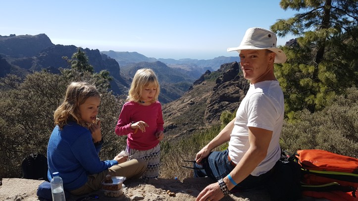 Det var bra med frekventa stopp, för slingrig bergsväg gör sig dåligt tillsammans med åksjuka barn i baksätet. Mitt upp i alltihop låg en liten kiosk/restaurang där vi köpte torkade fikon, honungsglaserade mandlar, glass och smoothie. Då hade temperaturen droppat ner till ca 10 grader, så det märktes att det blev svalare på höjden. Väderprognosen för Roque Nublo var +5 grader och molnigt, så vi hade med oss dunjackor och ullunderkläder. Vilket skulle visa sig var nåååågot överklätt, kan man säga.