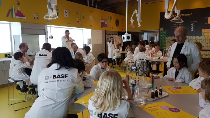 H är väldigt intresserad av kemi och kemiska experiment, så det var helt perfekt att det var experimentdags strax efter att vi kom….A roade sig själv under tiden medan jag och H (och ca 20 andra) tog på oss de vita rockarna.