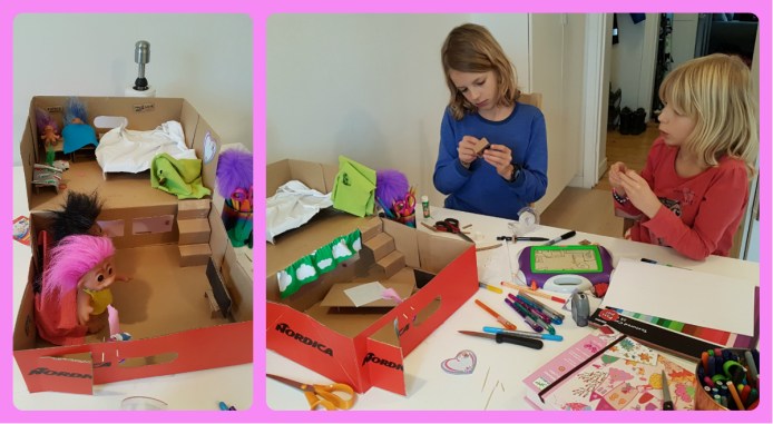 Jag hade massor av jobb att göra och hade tänkt sitta hela förmiddagen, men så var det någon som ville pyssla. Närmare bestämt bygga trollhus, sådär härligt old-school med skokartonger, tygbitar, lim och papp och inte via en app! (jodå om ni tänker efter kommer ni ihåg hur man gjorde)