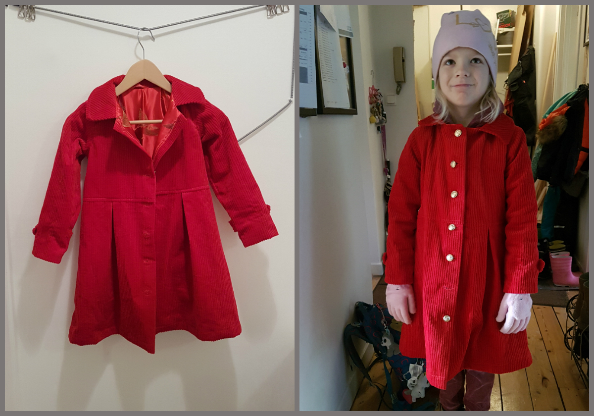 Det är bra när andra städar sina tygförråd för att dom tröttnat på att sy. Bra både för dom och för mig, eftersom dom blir (nästan) lika glada över att bli av med det dåliga samvetet över osydda tyger och tillhörande svikna ambitioner som jag blir av att få en godislåda full av roliga tyger. I en sådan utrensning har jag fått ett jättefint rött bredspårigt manchestertyg, som skulle bli en kappa till H.