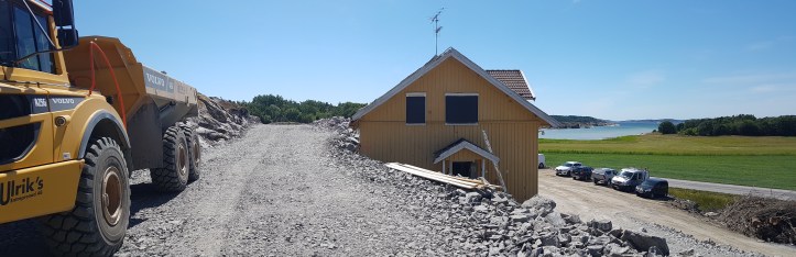 Vår väg kommer så sakteliga närmare det gula huset som vi har som platskontor. Väldigt nära kan man säga. Så nära att sprängningen igår i bergsknallen bredvid (ca 5 m från huset) reducerade huset med ett rum…Alla människor var utrymda med god säkerhetsmarginal eftersom sprängningen var så nära huset så det var ingen fara för liv eller hälsa för någon, och det var ju lämpligt.
