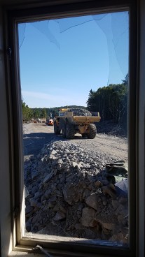 Vår väg kommer så sakteliga närmare det gula huset som vi har som platskontor. Väldigt nära kan man säga. Så nära att sprängningen igår i bergsknallen bredvid (ca 5 m från huset) reducerade huset med ett rum…Alla människor var utrymda med god säkerhetsmarginal eftersom sprängningen var så nära huset så det var ingen fara för liv eller hälsa för någon, och det var ju lämpligt.