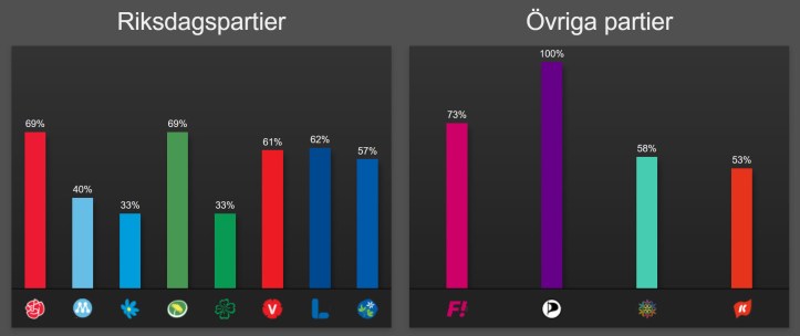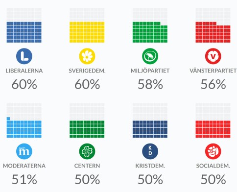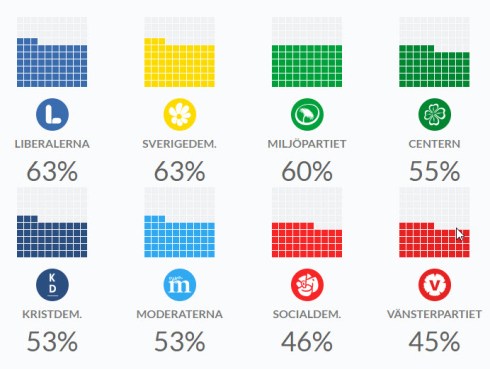 Tex att jag svarat att jag är emot ett tiggeriförbud för att jag tror att det inte ger något (iofs okontroversiellt – alla utom M tycker det), eller att jag tycker att alla religiösa friskolor ska förbjudas (hej SD och L…), eller att jag inte är för 6 timmars arbetsdag (visst vore det skönt, men jag tror inte det är realistiskt), att jag tycker att Arbetsförmedlingen bör läggas ner (ärligt talat har jag inte tillräckligt på fötterna för det påståendet, men det jag sett tycker jag inte pekar på att det är en meningsfull aktör) och att jag inte tycker att man ska ha niqab i skolan.
