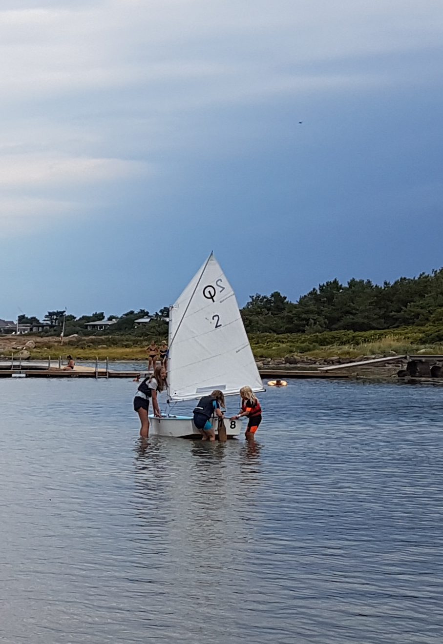 De andra optimisterna seglades av lärare från seglarskolan som chillade runt lite, och dom var så gulliga och kom runt till dom och gav lite tips när det behövdes. Så dom tog sig i mål som näst sista båt av optimisterna och var nog rätt nöjda med sig själva – med all rätt!