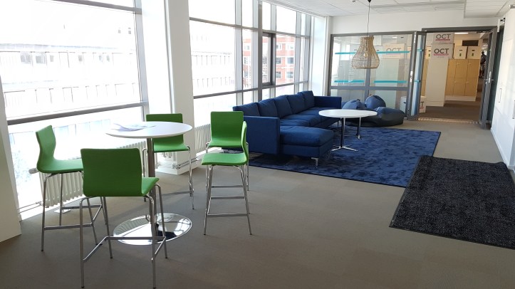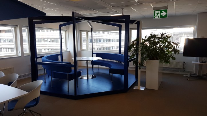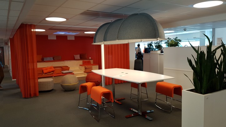 Här och där är det insprängt alternativa miljöer som bryter av raderna av skrivbord. Eller, det är inga rader av skrivbord; det är små kluster med 8-10 platser i varje innan det bryts av med mötesrum, annan möblering, fikaplats (i aktiv zon då…).