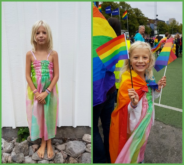 Regnbågar är grejen i vanliga fall, och ännu mer när det är Pride. Så ner och gräva i tyglådorna och komma upp med ett regnbågsfärgat tyg, tunt som tok, helt omöjligt att klippa.