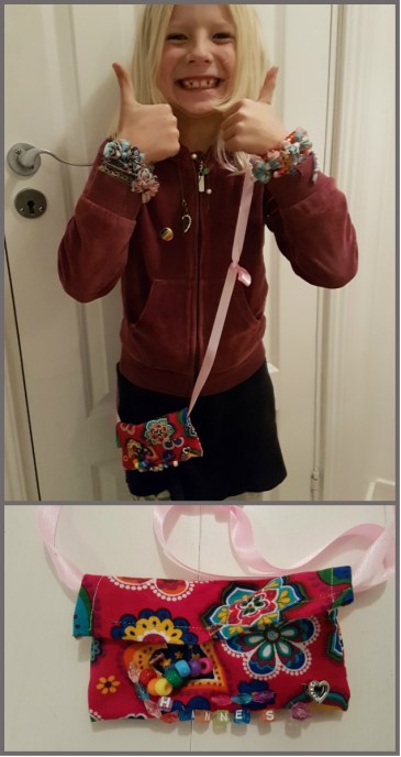 Det roliga är att han själv har bestämt hur den ska se ut, vilket tyg det ska vara, vilka pärlor och hur dom ska sitta, och sen genomfört det hela vägen. Det finns mycket jag skulle kunna tala om för honom om hur man gör handväskor, men jag höll mig till basics och några tips som tex att det är bra att fålla och att sy sidsömmarna från avigan.