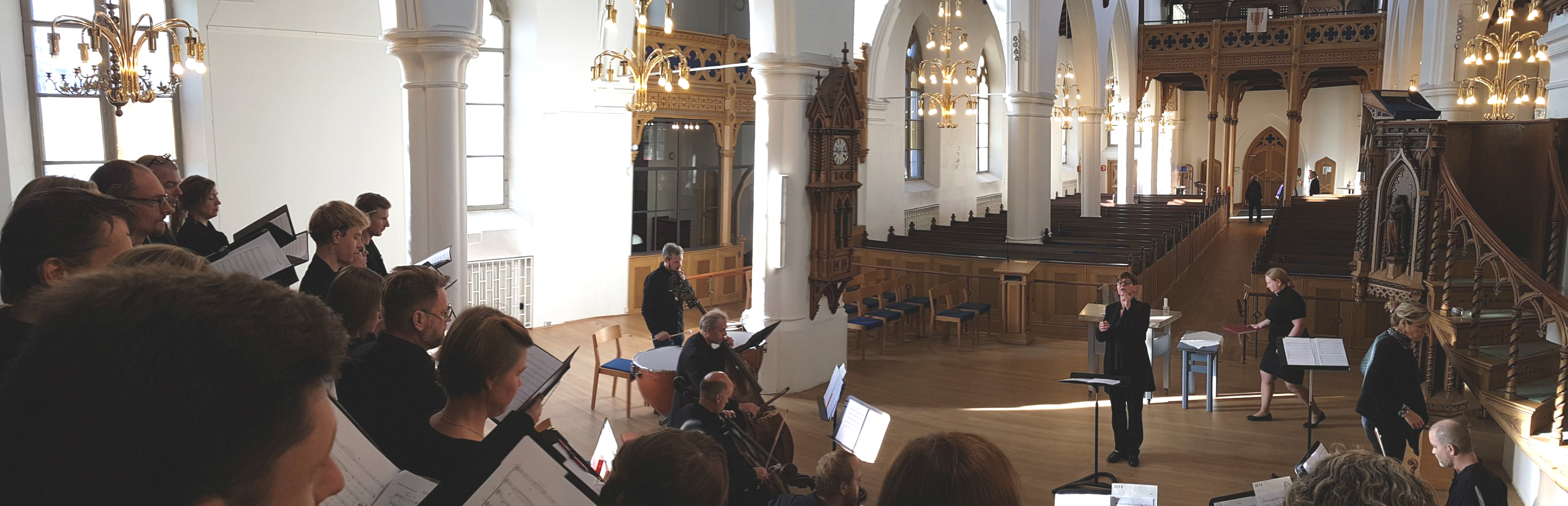 Liten stråkorkester med musiker från Göteborgsoperan och Göteborgs konserthus (fullblodsproffs alltså); två fioler, en viola, två celli, kontrabas och slagverk. Dom ska uruppföra ett stycke av Mikael Carlsson som sjunger i vår kör och som skriver musik på löpande band, vi har en solist som ska sjunga något av Strauss, och så ska vi själva göra Matthew Coleridges Requiem.
