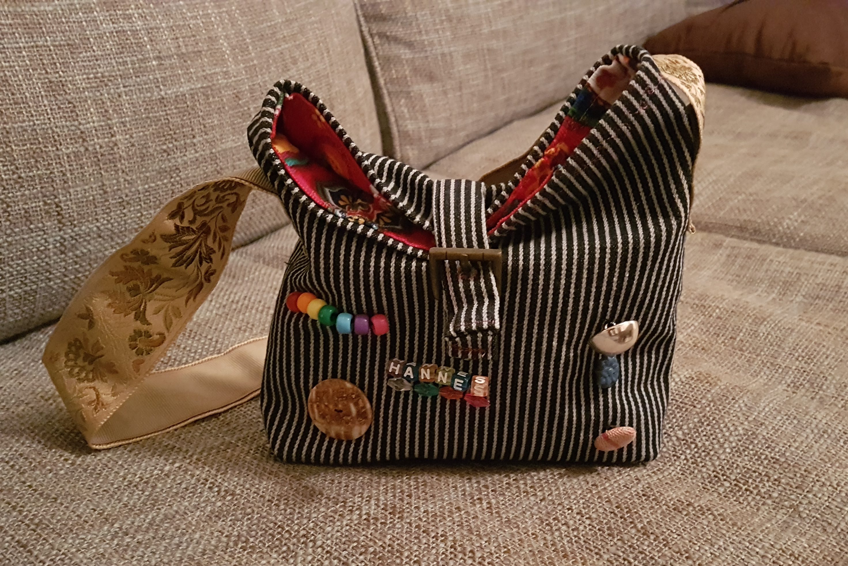 Efter besvikelsen med den förra handväskan och att den inte blev riktigt som den mentala bilden av en handväska, lovade jag att hjälpa till att göra en ny, en där vi hade tex ett mönster (bra idé va?). Jag valde tyger som är lite bättre, läs: stadigare, och fäste pärlorna ordentligt på. Men han har sytt själv och har väl lärt sig något om att använda en symaskin, även om jag satte på spännet och axelbanden.