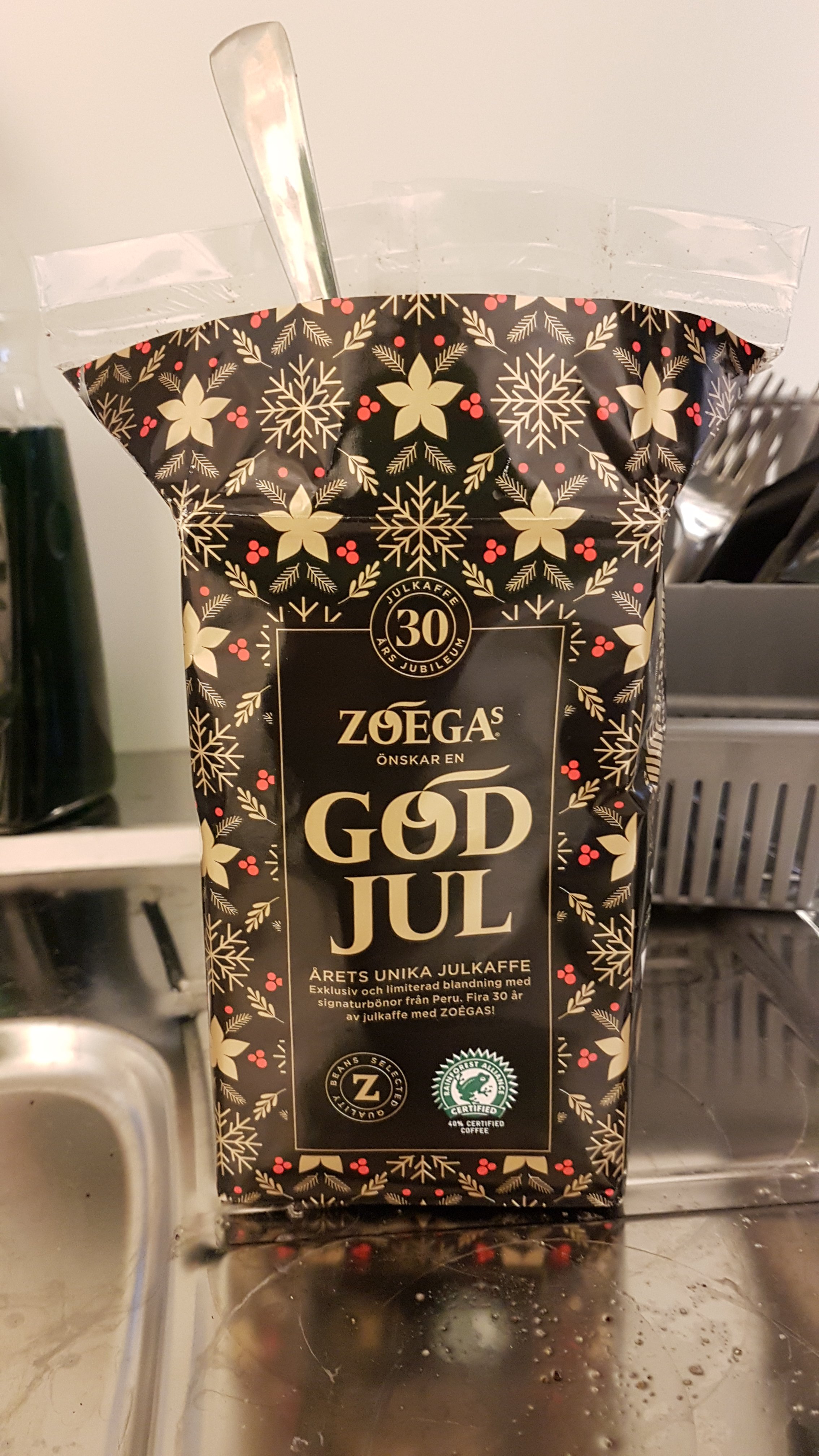 Äntligen är det i butik – Zoega’s julkaffe! Jag var bara tvungen att köpa det upp till bygget idag. Stark smak av nejlikor tyckte jag, så gillar man inte det passar det nog inte riktigt.