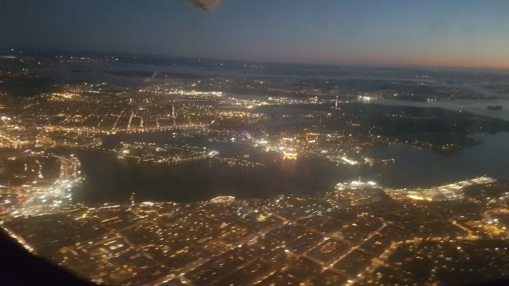 Sista dagen i Stockholm för i år vad jag vet. Avslutning på kursen i Entreprenadjuridik börjar med flott inflygning till Bromma medan solen gick upp i öster. Stadsgårn med finlandsfärjorna i nederkant, Nybroviken till vänster i mitten, Skeppsholmen och Blasieholmen, Gamla Stan. Den skarpögde kan i det suddiga fotot urskilja Grand Hotel.