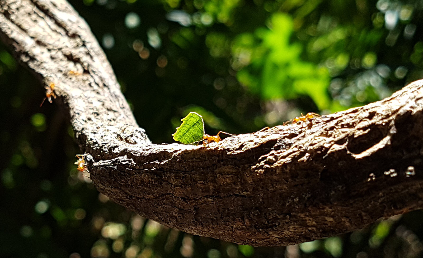 Men dom hade även byggt ett litet ”reservat” för myrorna som skär av bladbitar och bär hem, lämpligen kallade ”Leaf-cutting ants”. Reservatet bestod i en fiffig lösning med en gren på pelare som vilade i vatten, så myrorna kunde inte komma därifrån även om de ville. Dagligen lades det ut blad för dom att kapa av och bära hem till sitt bo (som man kunde kika ned i) och låta bli svampar som dom sen äter av. Det är alltså DET dom har bladen till – att skapa mögel….sooo disappointed. Jag trodde dom gjorde något mer av dom, men jag antar att överleva är tillräckligt för de flesta egentligen.