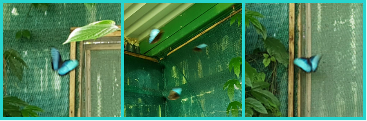 Rätt coolt att dom är så oansenliga på utsidan och så fantastiskt vackra på insidan. Inte lika coolt att dom så fort dom sätter sig ner och är stilla (=fotograferbara) fäller ihop sina vingar för att se ut som en orm eller ett par ögon och döljer det vackra blå. Så jag bjuder på ett misslyckat collage över mina försök att fånga Blue Morpho: