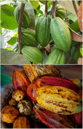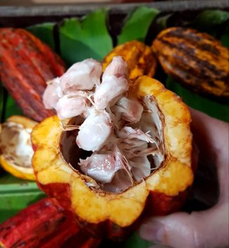 De mogna frukterna plockar man (obviously; svårt att få ut någon kakao annars) och plockar ut de slemmiga, stora fröna.