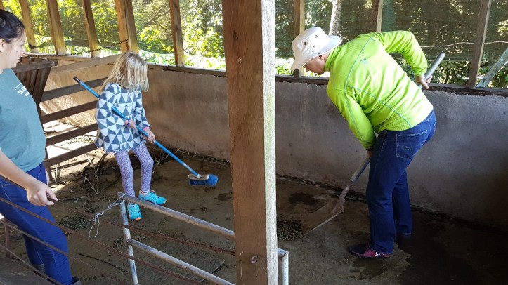Frukost kl 07 på Finca Paradiso; Pinto (bönor och ris), ägg för de som ville ha det, ost gjord på gården, bröd och kaffe. Känt koncept. Sen ner och mocka skit i gris/kalv/vaktel/kyckling-huset, under överinseende från dottern i huset, Carolina.