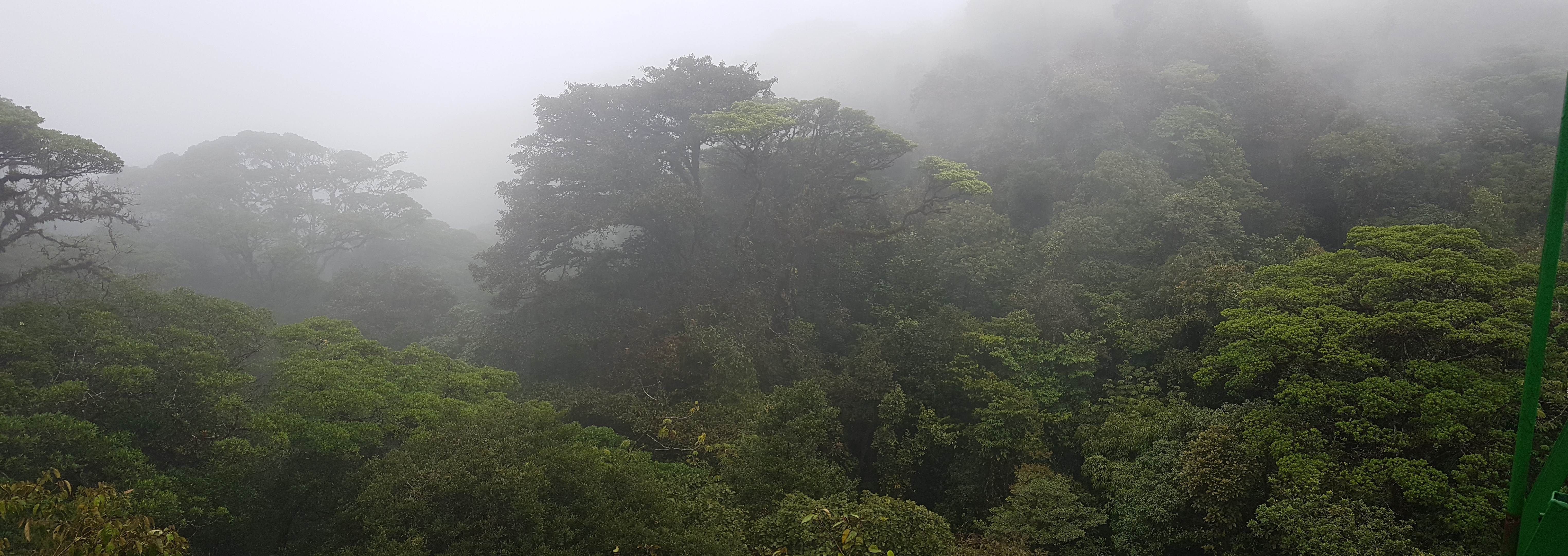 Uppe i trädtopparna på hängbroarna är det vackert. Molnskogen driver in och ut och det varierar från klart till fullständig dimma.