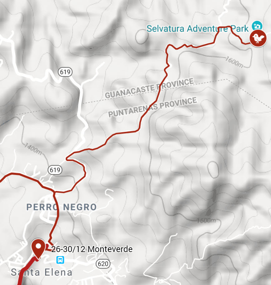 Här i området finns det ett ställe som heter Selvatura Adventure Park, och det är ett jättestort ställe där man kan göra allt möjligt som vi turister kommer just upp till Monteverde för att göra; Åka zipline, vandra i regnskog och molnskog, se kolibrier, insekter, fjärilar och ödlor och säkert en massa andra grejer. Men jag gillar inte när en stor aktör gör för mycket business och tar från de små, så vi har spritt våra gracer lite och gjorde ju tex fjärilstur häromdagen på ett mindre ställe. Åka zipline var (tyvärr) inte heller aktuellt, för alla i familjen var inte lika entusiastiska, och om det kostar $50 att åka turen så ska det banne mig till att alla som åker vill.