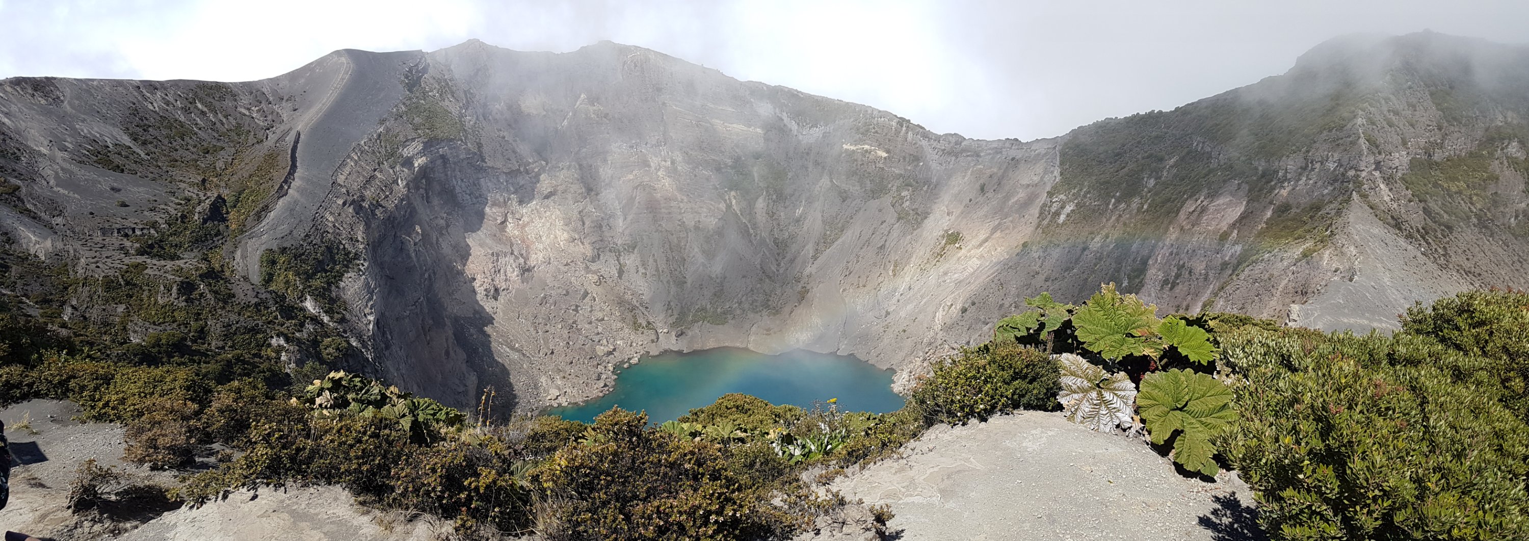 Anyway, fantastiskt cool utsikt över den nedre kratern från utkikspunkten. Galet branta väggar (Oskar sa att om det varit snö på dom hade han inte åkt ner, det säger något om hur brant det var…) Och när vi stod där uppe kom det in en liten dusch från något av molnen som drev runt hela tiden och vi fick oss en liten regnbåge!