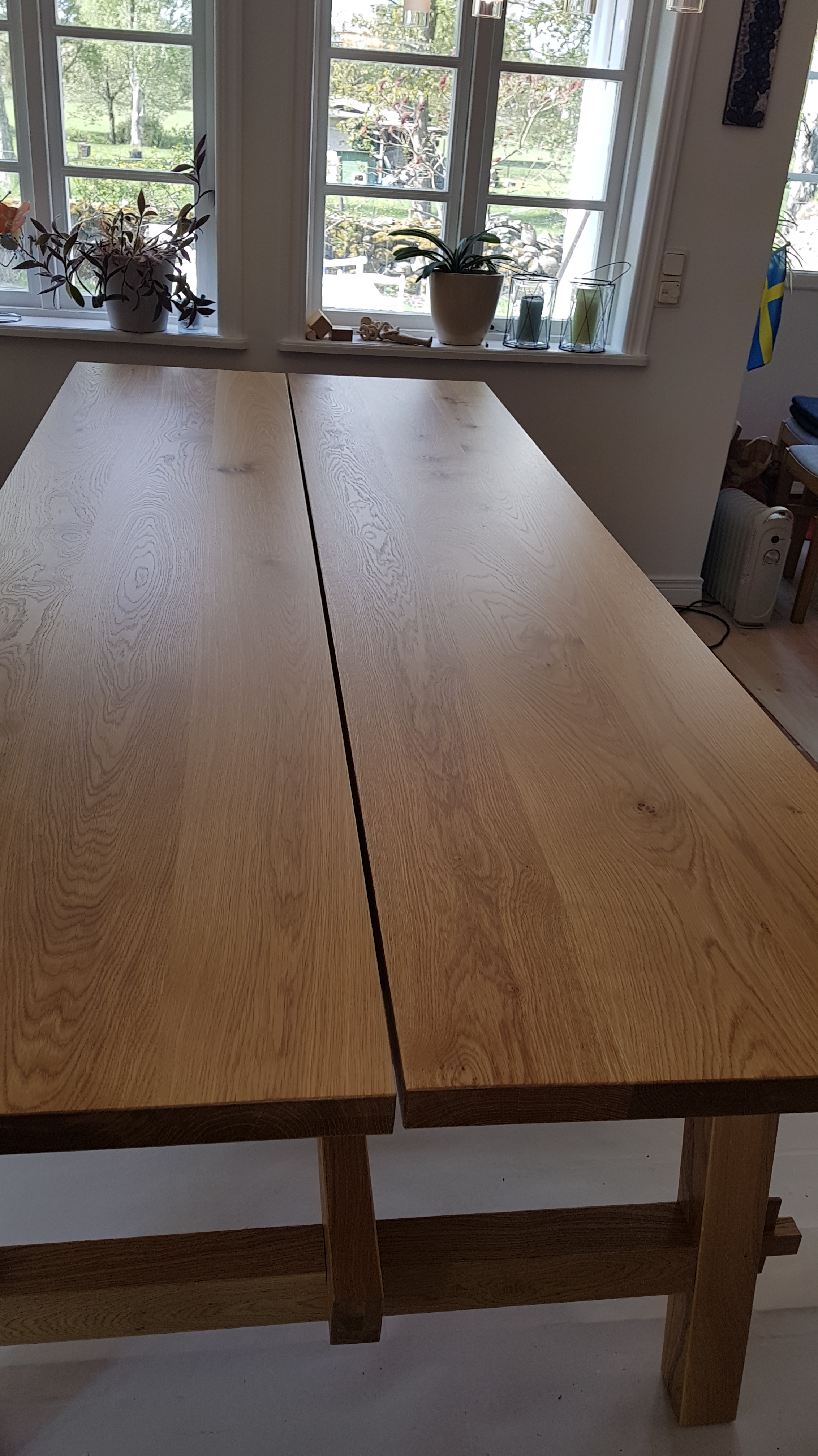 Hela bordet monterades upp och ner för att sedan svängas runt på det sätt som ett bord ska stå. Ja, i den mån man kan ”svänga runt” något som väger nästan hundra kilo, men jag har en mycket envis och stark man och han löste det hela med bravur såklart.