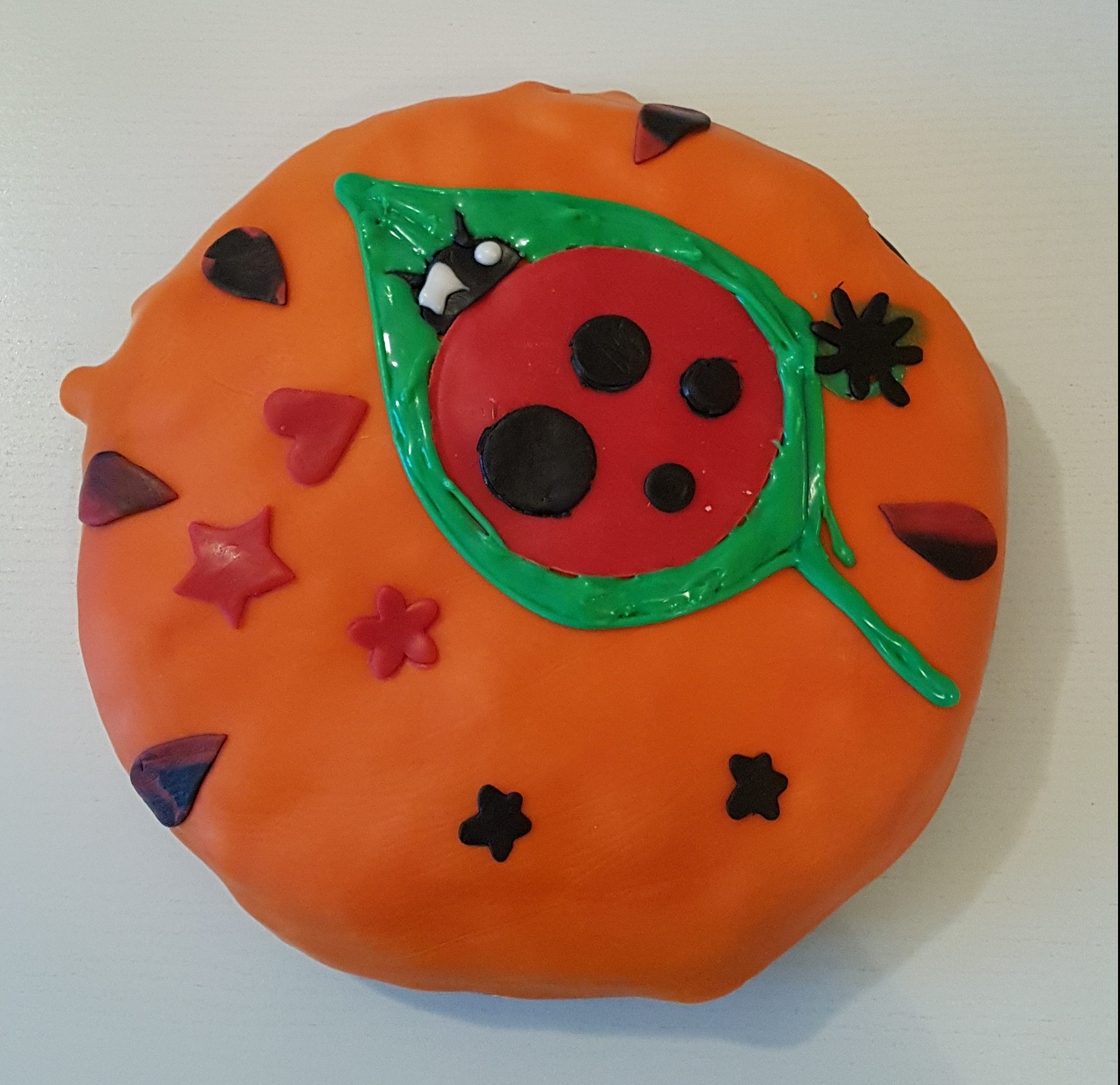 Som tur är kommer den grabben med viss flexibilitet, så enhörningen blir snabbt till en nyckelpiga (vi har röd, orange och svart fondant kvar sen halloween, inte riktigt enhörningsfärger), och vi är genast överens om att det är en god idé att köpa färdiga tårtbottnar.