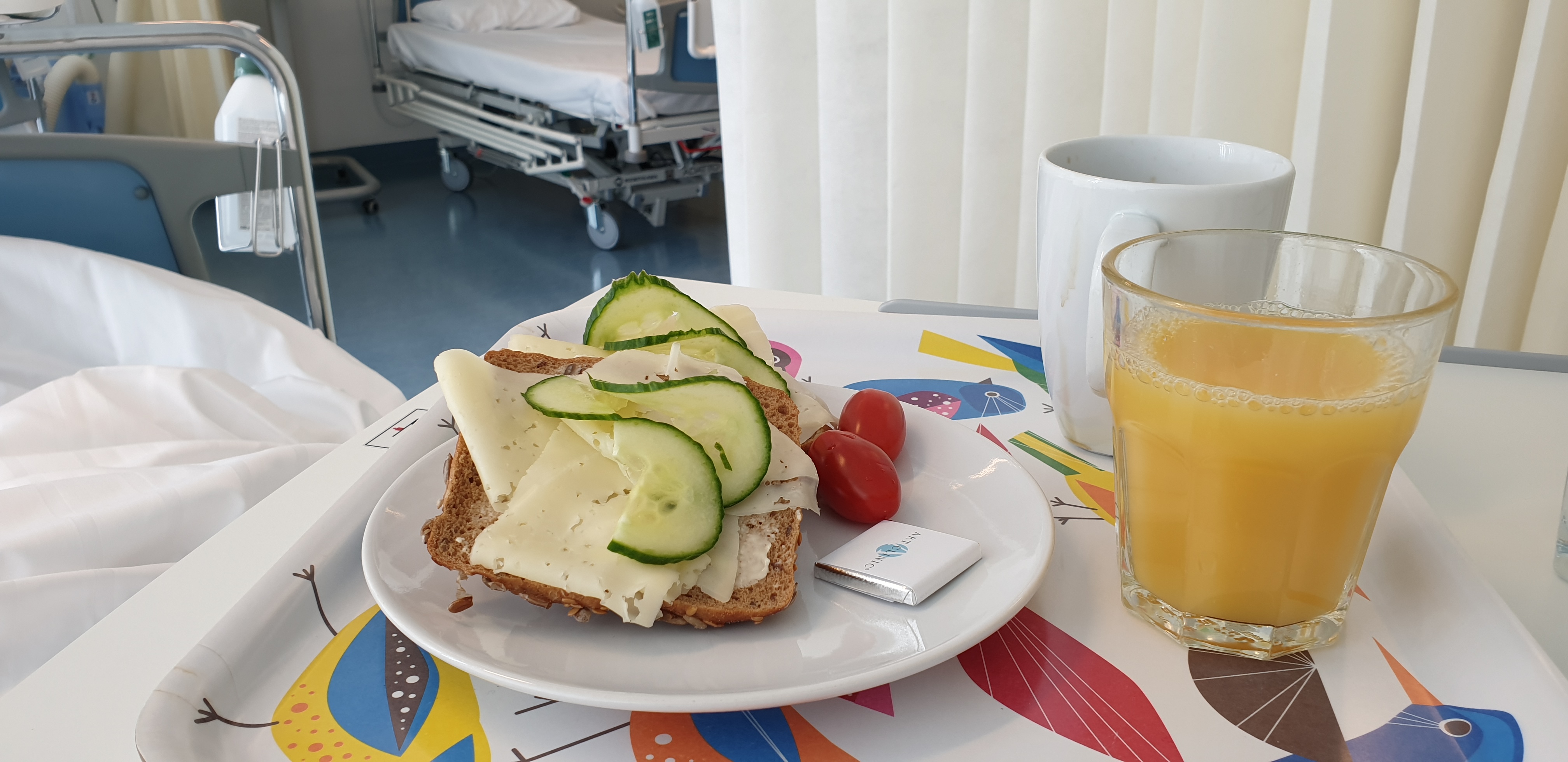 Dagens första måltid; ostmackor, juice, kaffe och en liten chokladbit och sen väntan på kirurgen Peter som tydligen försökt prata med mig tidigare men då var jag så borta att jag inte ens mins det.