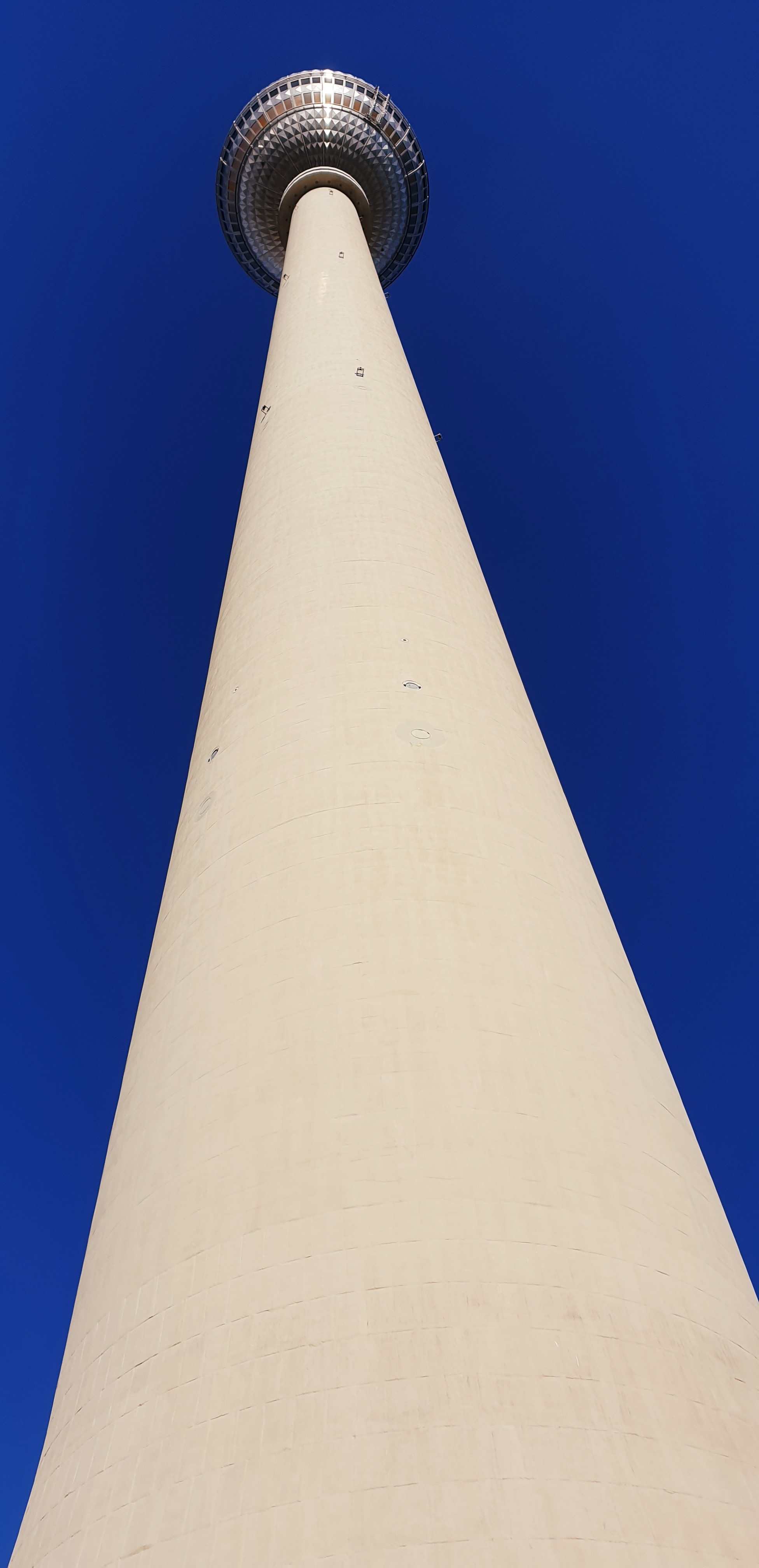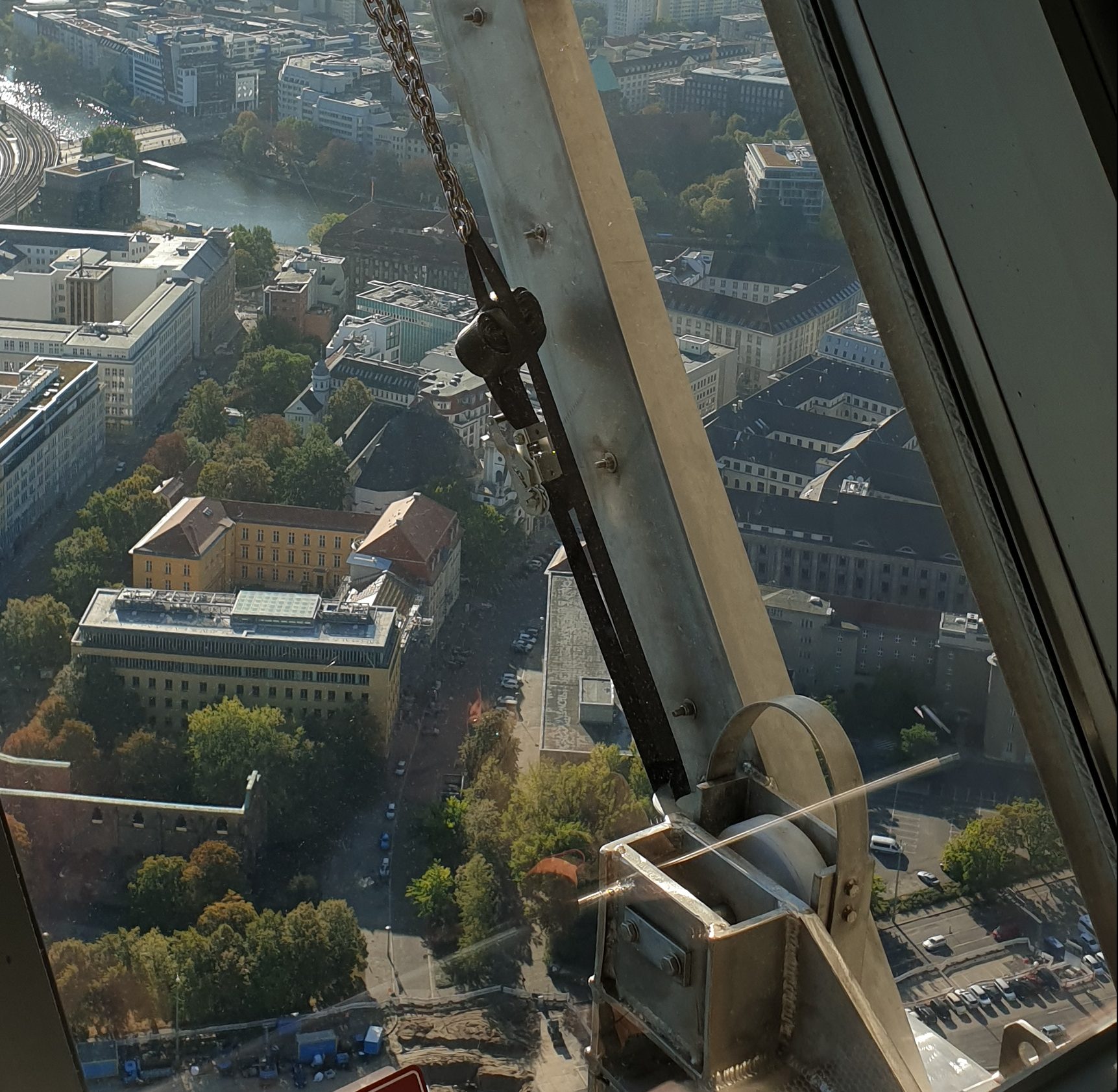 Mannen i uniform som körde hissen upp hälsade välkommen till Fernsehturm Berlin, gratulerade oss till det vackra vädret, upplyste oss om att vi åkte uppåt med en sjättedel av ljusets hastighet (här brast jag och O ut i skratt men vi var de enda i den packade hissen, antar att de andra inte lyssnade) och med sin entusiastiska men ytterst monotona stämma upplyste han oss om att vi idag hade möjligt att se ända till (här trodde jag han skulle säga Eiffeltornet) Empire state building. Subtil humor så det skriker om det, perfekt start på dagen. Bara jag och O tyckte det var roligt – eller så var vi de enda som lyssnade. Alternativt var vi de enda som visste att det ligger i New York, men så illa var det nog inte.