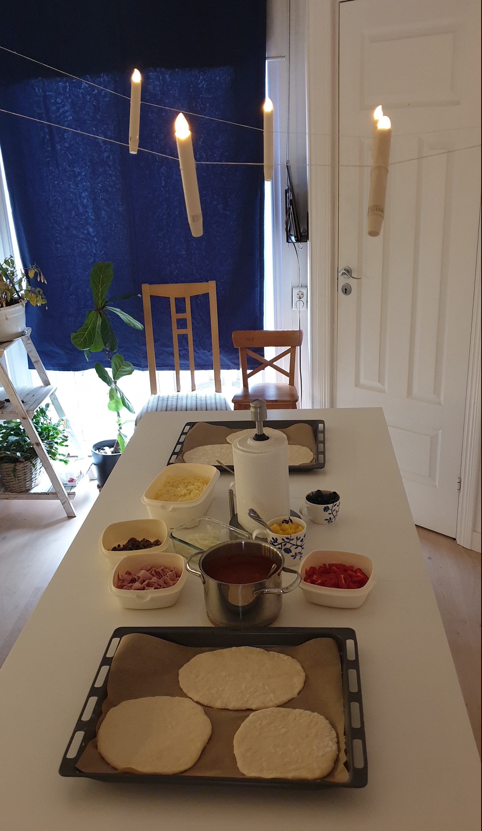 Mat. Dom behöver säkert mat. Och eftersom vi tillämpar barnarbete i det här hemmet ska dom göra sina pizzor själva. O har gjort pizzabottnar i vad vi tror är en passande storlek för en tioåring, tillbehören är preppade i lådor och dom ska bara få på den topping dom menar att dom vill ha.