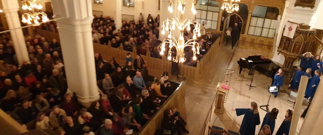 Vi (Haga Motettkör), Haga kyrkokör och Hagakyrkans barnkör, som en enda stor familj. Eller nåt. Vi stod på läktaren och de andra var där nere i koret. Och det var som förväntat; kyrkokören var väldigt mycket kyrkokör, barnkören sjöng illa men det var så gulligt ändå, och vi var bra vi också.