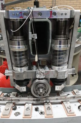 Anordningen består av 4 armar jämnt fördelade över en cirkel. Fjädrar orsakar en kraft från hjulet ner på den lilla, i mitt tycke rätt spinkiga rälen, men det kanske räcker för att se vad som händer och resultaten kanske är skalerbara upp till riktiga bredder och laster.