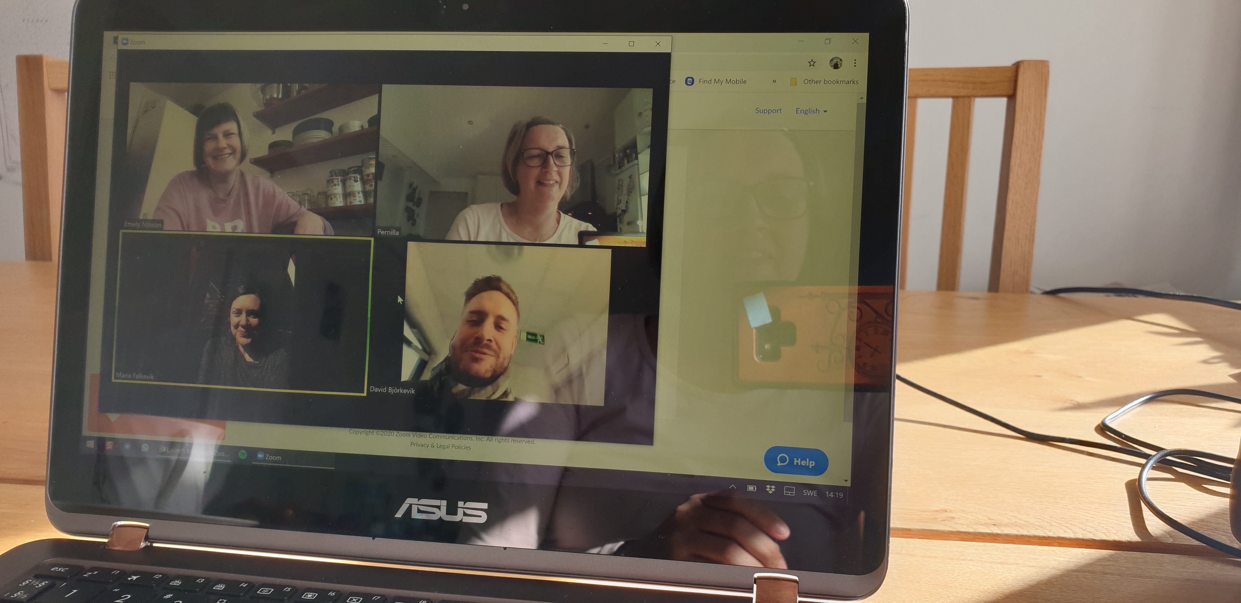 Vi har börjat ha nätfika kl 14 varje dag. Alla som vill vara med loggar in i mötesverktyget Zoom och så fikar vi en stund, snackar skit och umgås en stund tills folk droppar av till möten eller annat man gör på jobbet – även om jobbet är hemma i ens eget kök…
