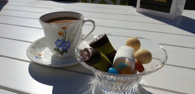 Årets första fika utomhus avnjöts på eftermiddagen. Barnen hade skickats ner till Åsas godisaffär för att köpa påskgodis till sig själva (det blev inga påskägg för den här familjen den här påsken. Inte ens ett enda påskpynt) och kom tillbaka hem med påsar som det stod ”Västkustens bästa godis” på, vilket ju lät lovande. Och barnen delade generöst med sig.