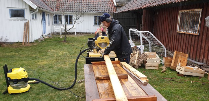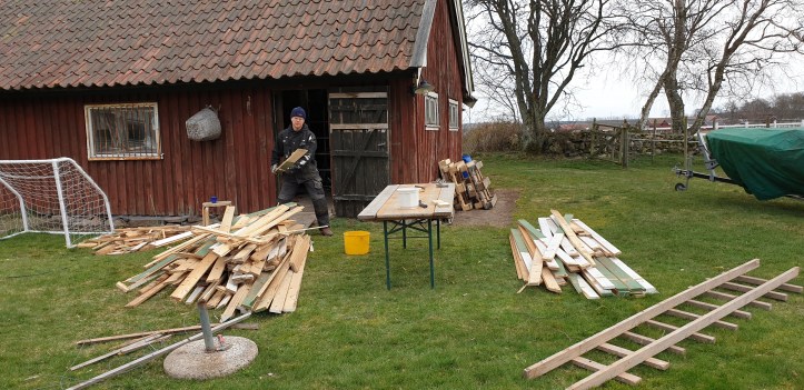 ….efter sol kommer som bekant regn. Både metaforiskt och arbetsmässigt. För det är inte lika kul att ta hand om det man rivit, som det är att göra själva rivningen. Men vill man ha ved så är det bara att sätta igång. Först dra ur alla spikar och sen såga i lagom långa bitar som passar vedspisen här nere i Åsa.