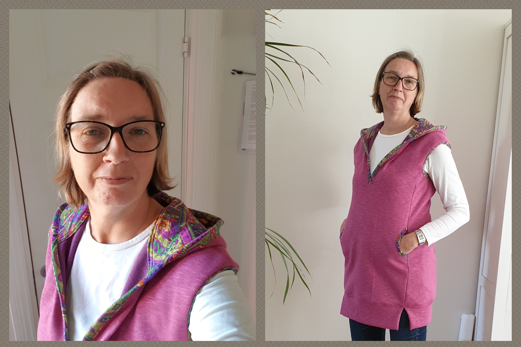 Några timmar till dagen efter, och så har jag numera en ärmlös munkjacka i rosa tjock jersey. Tyget som är på kantremsorna på fickorna, ärmhålen och halsringningen finns också på insidan av huvan.