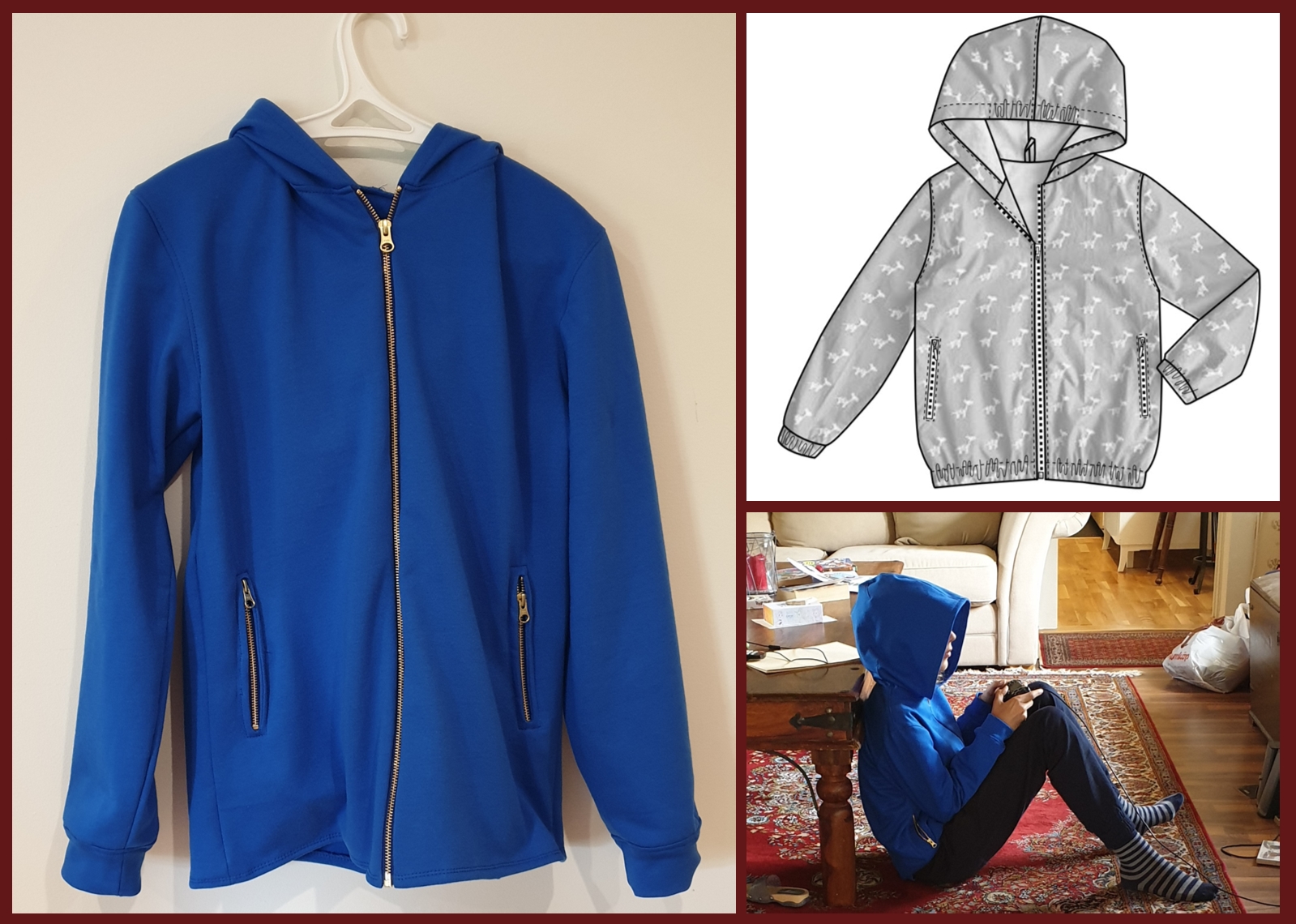 Dessutom är munkjacka/hoodie/hettegenser favoritplagget för dagen men han saknar en att ha på träningen, så….Några klick senare och en beställning var lagd på ett kornblått sweatshirttyg, som kom igår. Mönster hittat (Ottobre som vanligt), lite klipp och sy och idag var tröjan färdig. Det känns som att det är en syfabrik här hemma för tillfället (yaaayyyy!!)